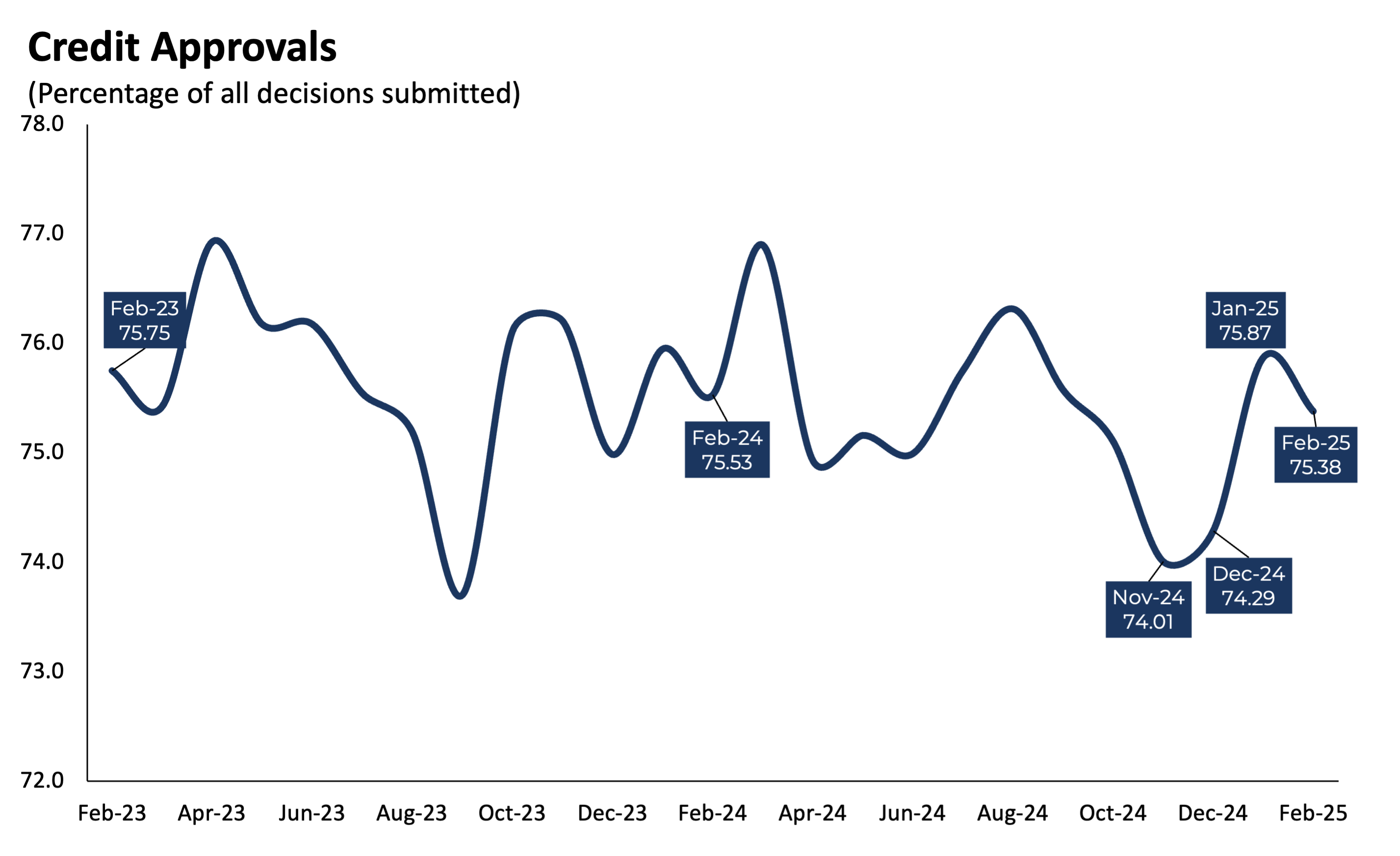 Credit approvals continue to hover around 75%. The average credit approval rate dropped to 75.4%, a decline of roughly half a percentage point. However, the rate remains well above the levels seen at the end of 2024.