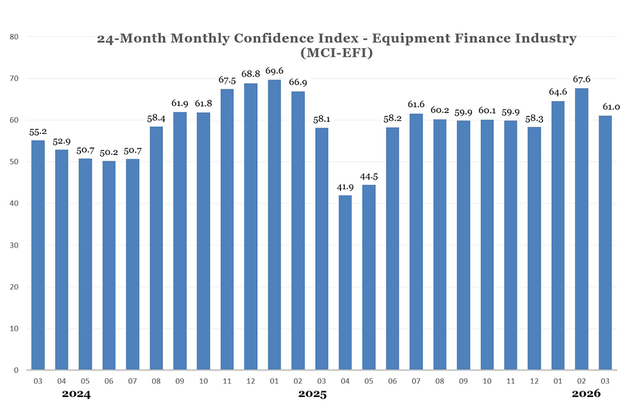 Confidence in the equipment finance market rose to 64.6, up from 58.3 in December.
